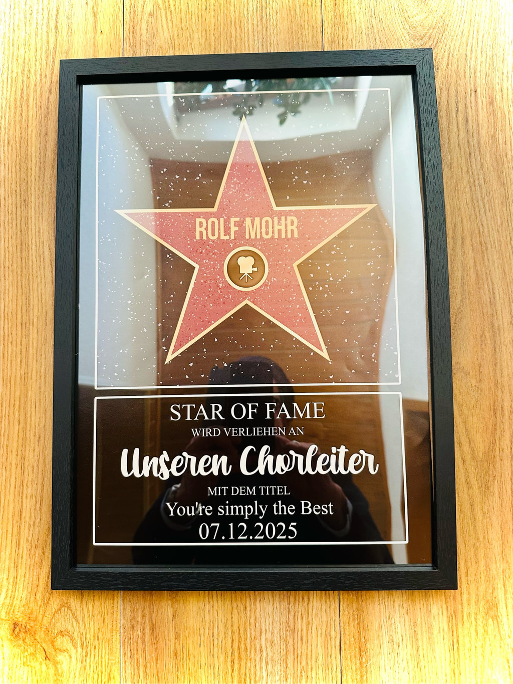 Herr Mohr durfte sich über eine große, liebevoll handgemalte und handgeschriebene Dankkarte freuen, auf der alle Choristen unterschrieben haben. Außerdem gab es für ihn eine Star-of-Fame-Urkunde, ganz im Stil der berühmten Hollywood-Sterne – als symbolische Ehrung für seine außergewöhnlichen Verdienste um unseren Chor. ⭐️